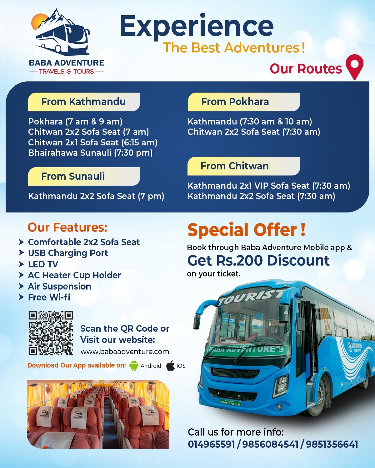 Baba Adventure Travels & Tours offers daily tourist bus ticketing services between Kathmandu, Chitwan, and Pokhara. Book your tickets easily through our website and enjoy a hassle-free, confirmed reservation.